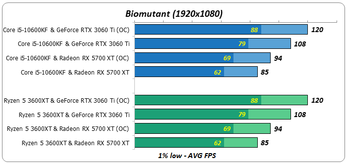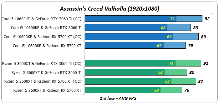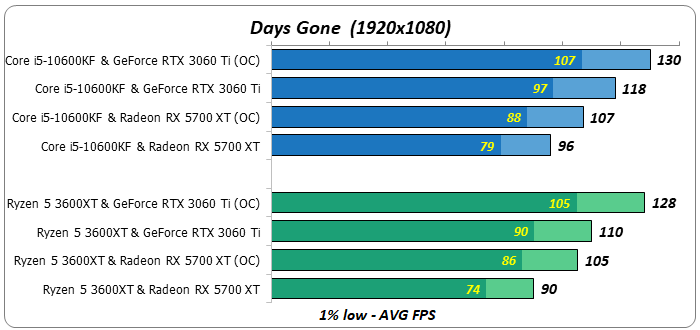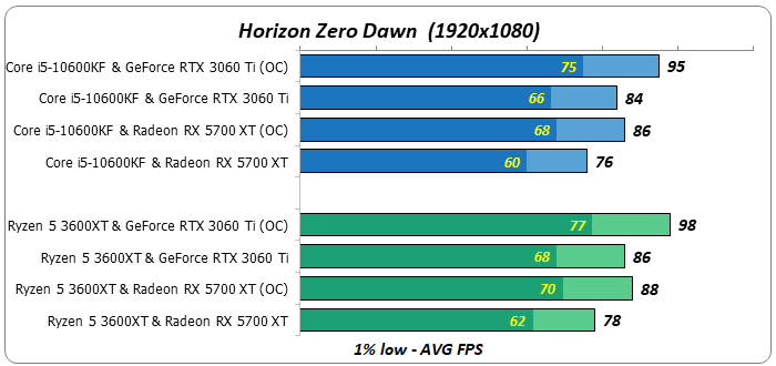 - Конфигурация Core i5-10600КF & GeForce RTX 3060 Ti была в паритете со связкой Ryzen 5 3600XТ & GeForce RTX 3060 Ti в играх Assassin's Creed Valhalla, Biomutant, Days Gone, Horizon Zero Dawn,.