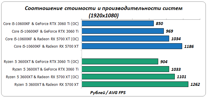 Рублей / average FPSПо соотношению цена/производительность лидировала связка Core i5-10600КF & GeForce RTX 3060 Ti.