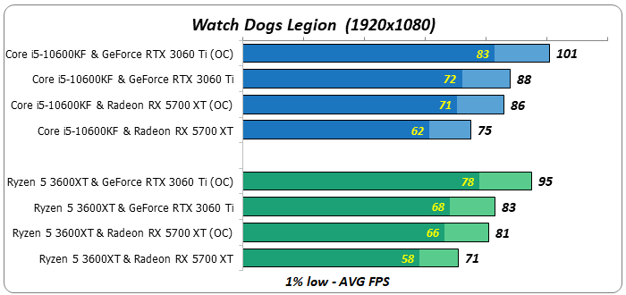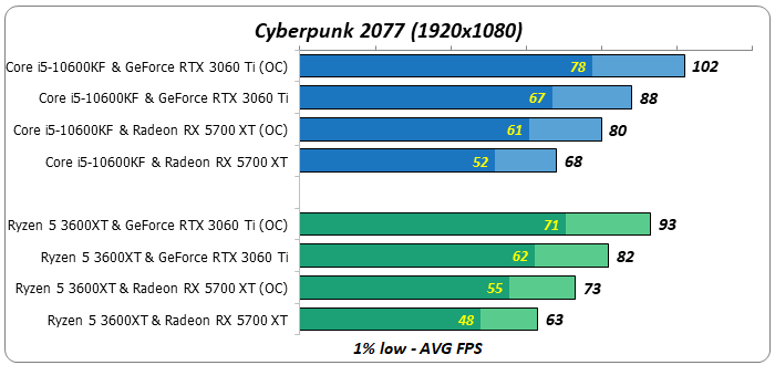 Система Core i5-10600КF & GeForce RTX 3060 Ti опередила связку Ryzen 5 3600XТ & GeForce RTX 3060 Ti в четырех играх из восьми протестированных и показала равные результаты в четырех проектах.