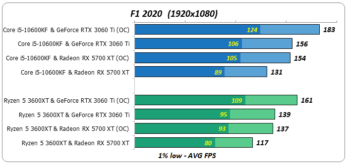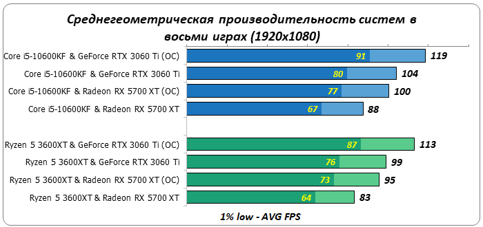 1% low и average FPSПо диаграмме среднегеометрической производительности систем в восьми играх видно, что лидировала конфигурация Core i5-10600КF & GeForce RTX 3060 Ti. Второе место заняла связка Ryzen 5 3600XТ & GeForce RTX 3060 Ti. На третьей позиции расположился игровой ПК Core i5-10600КF & Radeon RX 5700 ХТ.
