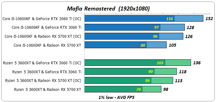 - Конфигурация Core i5-10600КF & GeForce RTX 3060 Ti опережала связку Ryzen 5 3600XТ & GeForce RTX 3060 Ti в играх Cyberpunk 2077, F1 2020, Mafia Remastered и Watch Dogs Legion.