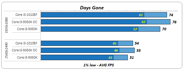 В играх Days Gone и F1 2020 в номинальном режиме работы лидировал процессор Core i3-10105F. После разгона его опережал «синий» сородич Core i3-9350K.