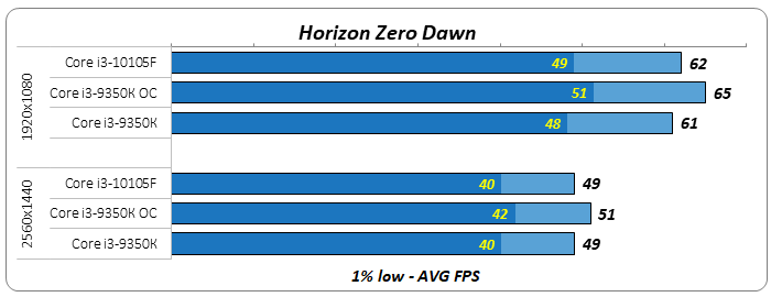 - Процессор Core i3-10105F был медленнее модели Core i3-9350K в игре Horizon Zero Dawn.