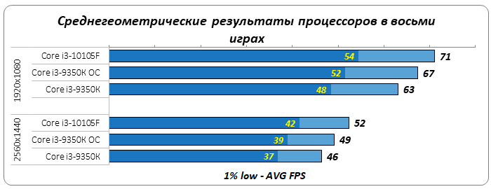 1% low и average FPSПо диаграмме среднегеометрической производительности процессоров в восьми играх видно, что лидировала модель Core i3-10105F. В зависимости от режима работы и разрешения она опережала Core i3-9350K на 5% – 14%.