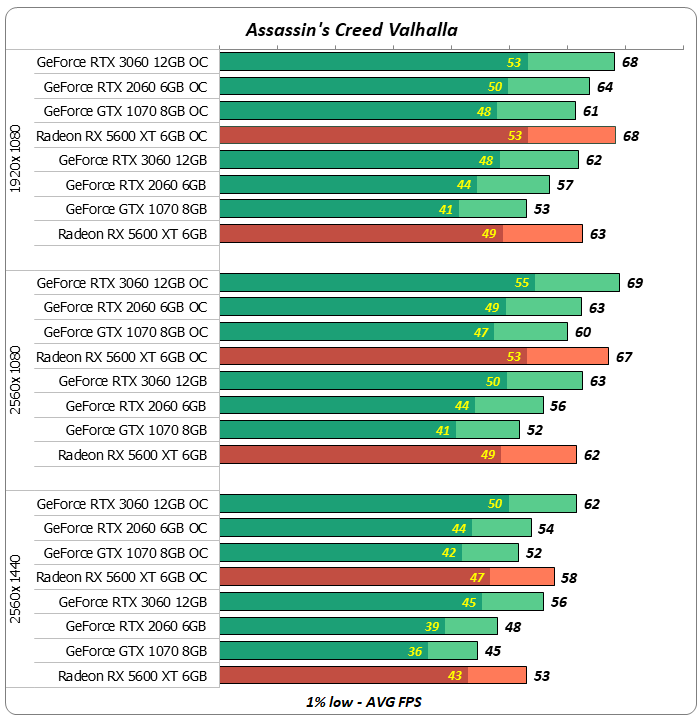 В игре Assassin's Creed Valhalla видеокарта Radeon RX 5600 XT смогла на равных соперничать с новичком из зеленого лагеря. "Старичок" GeForce GTX 1070 показал достойные результаты, совсем немного отстав от своего более "молодого" сородича GeForce RTX 2060.