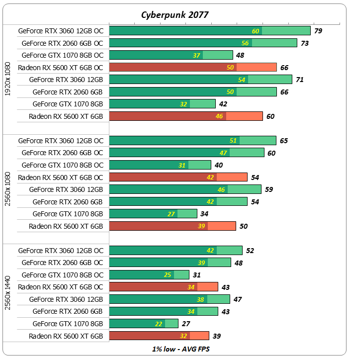 Также стоит отметить достойное выступление ветерана GeForce GTX 70. Несмотря на преклонный возраст по меркам игровой индустрии, во многих играх он был очень близок к современным картам GeForce RTX 2060 и Radeon RX 5600 XT. Плюс боевой пенсионер обеспечил комфортную производительность в большинстве протестированных игр, правда, только после разгона. Единственной серьезной осечкой стал проект Cyberpunk 2077, который оказался не по зубам старичку даже в народном разрешении 1920х1080.