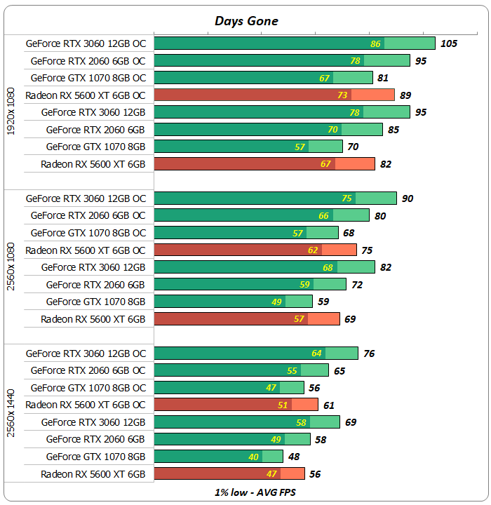 В зомбо-боевике Days Gone карта GeForce RTX 2060 была немного быстрее Radeon RX 5600 XT.