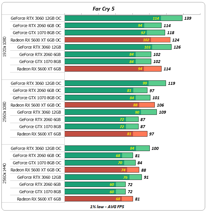 В игре Far Cry 5 красная видеокарта заметно опережала графические ускорители GeForce RTX 2060 и GeForce GTX 1070.