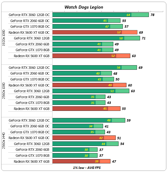 В проекте Watch Dogs Legion ускоритель Radeon RX 5600 XT был на 23%-30% быстрее зеленых карт GeForce RTX 2060 и GeForce GTX 1070.
