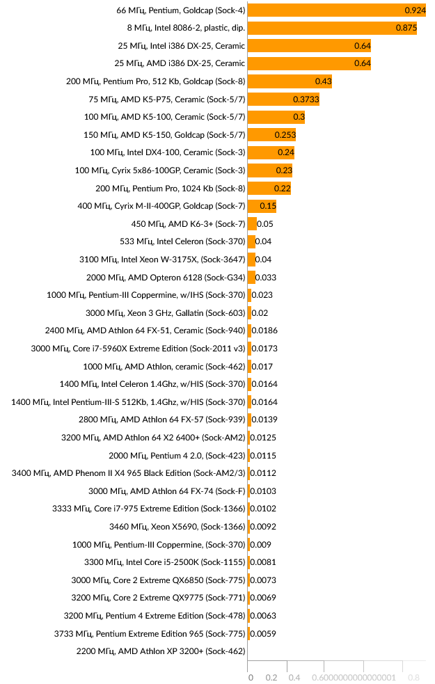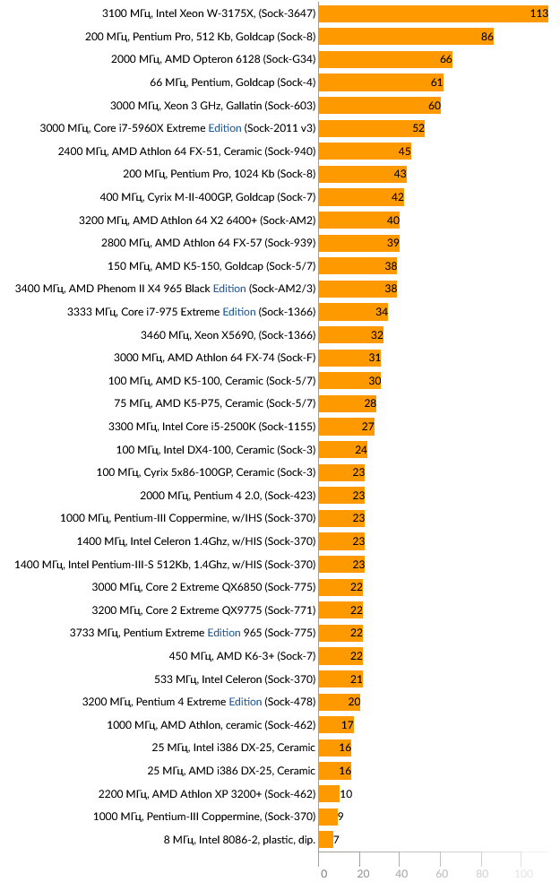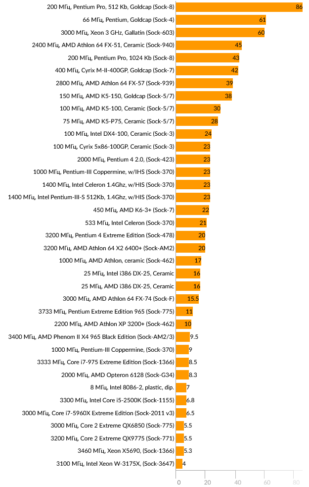 В данном тесте цифры очень маленькие, но в лидерах неожиданно оказывается керамический Pentium с частотой 66 МГц, который устанавливался в Socket 4. Он обогнал даже пластиковый Intel 8086-2, что является очень хорошим достижением.