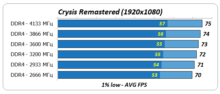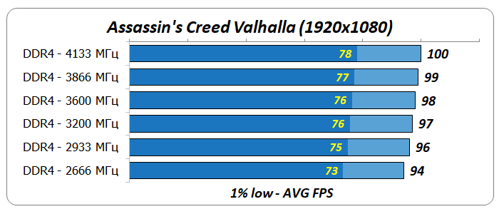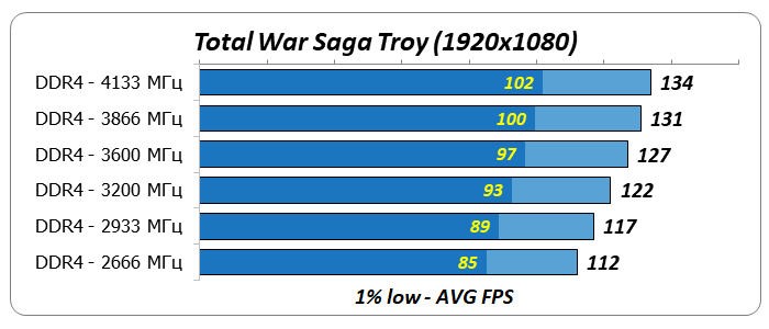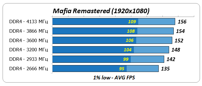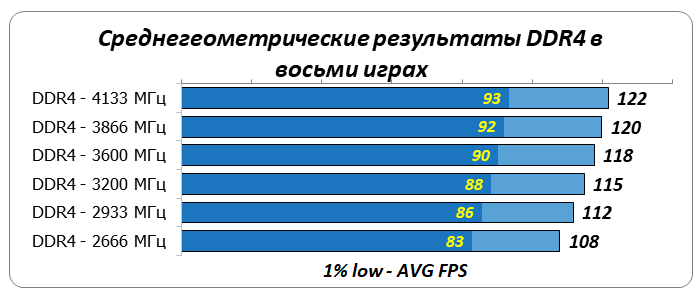 1% low и average FPSПо диаграмме среднегеометрической производительности оперативной памяти в восьми играх видно, что ее частота заметно влияла на результаты процессора Core i7-8700K. Увеличение тактовой частоты DDR4 с 2666 до 4133 МГц привело к росту производительности на 12-13%.