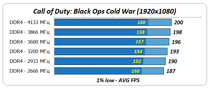 - Повышение частоты DDR4 незначительно влияло на производительность ЦП в играх Assassin's Creed Valhalla, Call of Duty: Black Ops Cold War, Crysis Remastered.