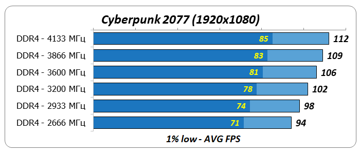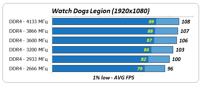 - Повышение частоты DDR4 значительно влияло на производительность ЦП в играх Cyberpunk 2077, Mafia Remastered, Project CARS 3, Total War Saga: TROY и Watch Dogs Legion.