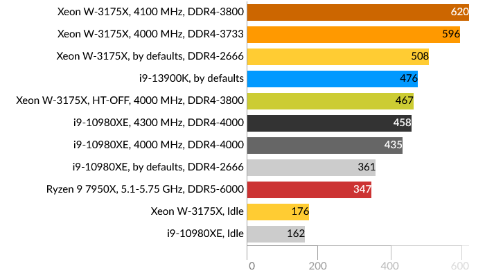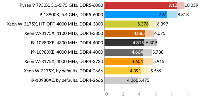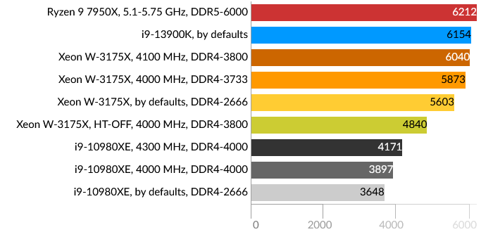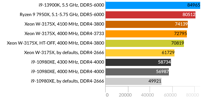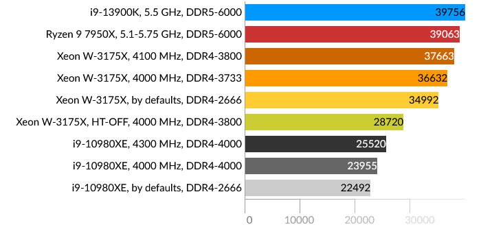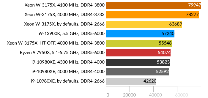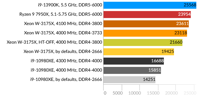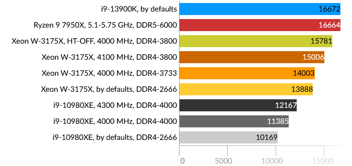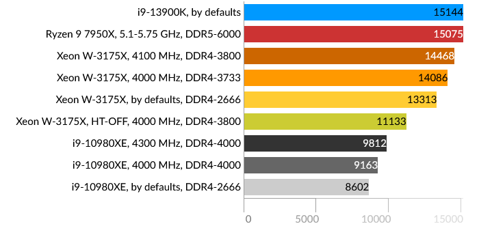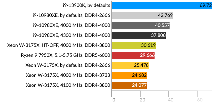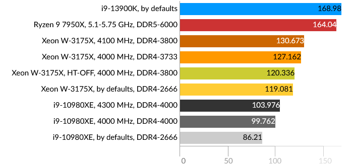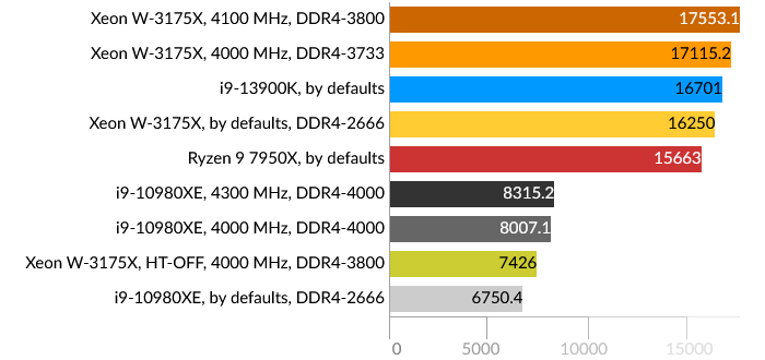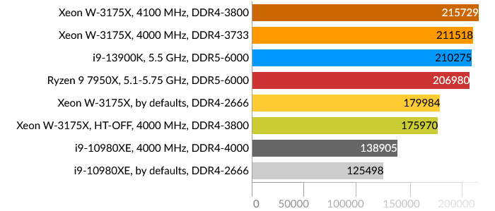 Сразу бросается в глаза проигрыш Intel Core i9-13900K, причем даже Core i9-10980XE. Подозреваю, что проблема больше в самом тесте, и гетерогенная архитектура CPU в данном случае не подходит для таких расчётов, хотя по производительности E-ядра i9-13900K приблизительно равны ядрам HEDT обоих процессоров. Xeon W-3175X в данном тесте одерживает победу даже в штатном состоянии.