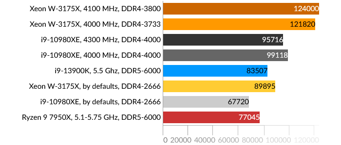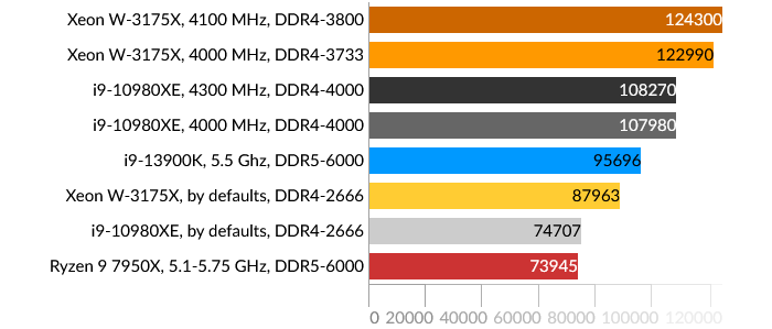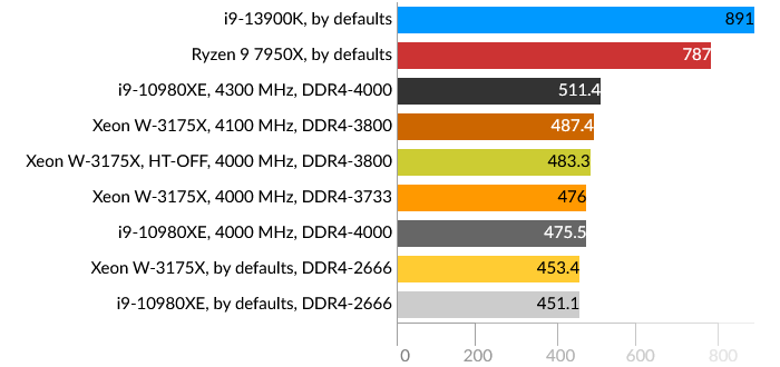 Здесь разворачивается борьба между четырьмя и шестью каналами DDR4-SDRAM памяти у представителей HEDT и DDR5-SDRAM у современных представителей десктопного сегмента. Шестиканальный контроллер Xeon W-3175X выглядит хорошо даже с памятью, работающей на частоте 2666 МГц.