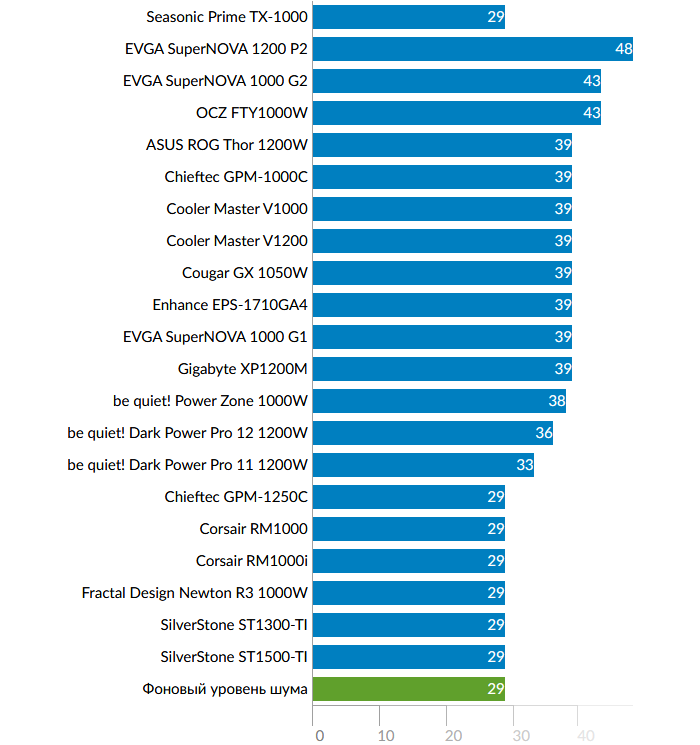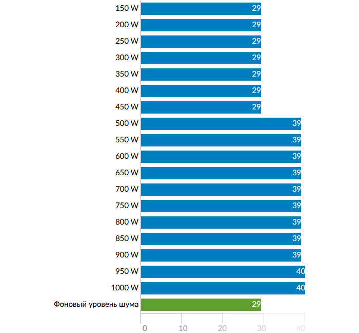 При высокой нагрузке TX-1000, напротив, чуть уступил другим «титановым» моделям по эффективности. Впрочем, реальная разница составляет менее 1% (с учетом округления). Вместе с тем этот блок оказывается одним из лучших в подборке по качеству стабилизации и демонстрирует отличные шумовые характеристики.