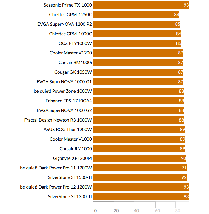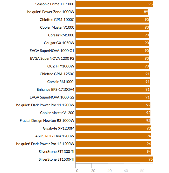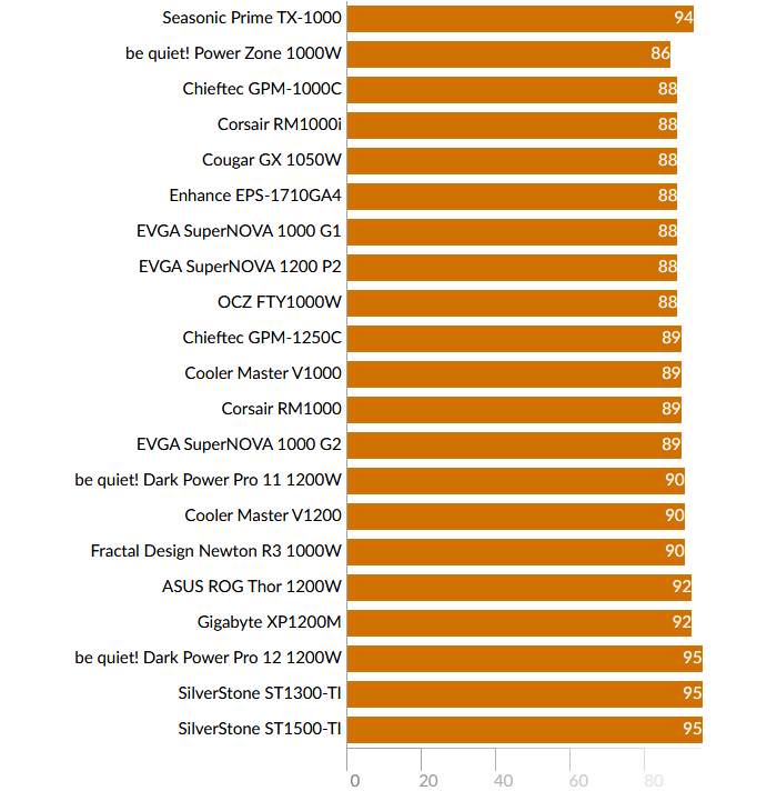 Тестирование на реальной системе, а не специализированном нагрузочном стенде, имеет свою специфику. К примеру, полученные нами значения КПД часто оказываются на 0.5-1% ниже заявленных производителем. Тем не менее, TX-1000 стал первым устройством в подборке, показавшим результат 96% (с учетом округления до целого числа). До этого БП с сертификатом 80 Plus Titanium в нашей лаборатории достигали только 95%.