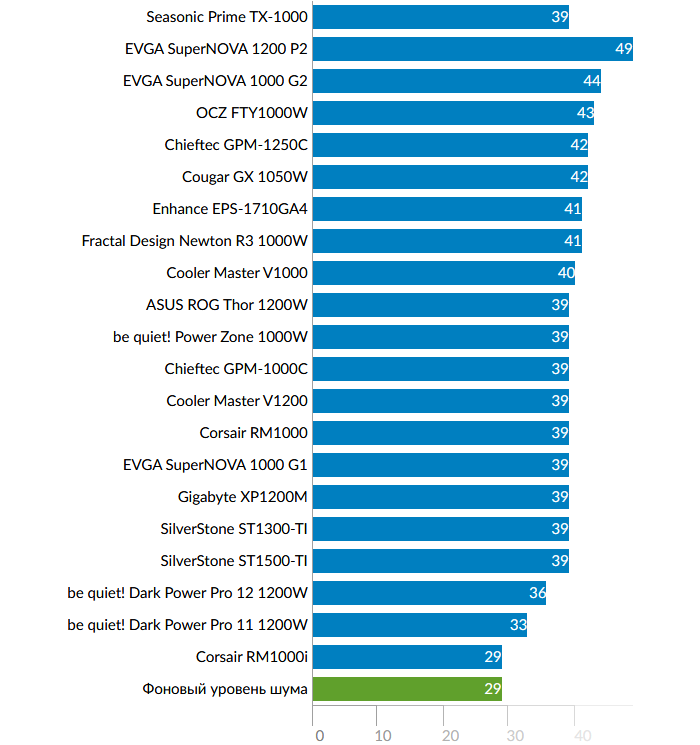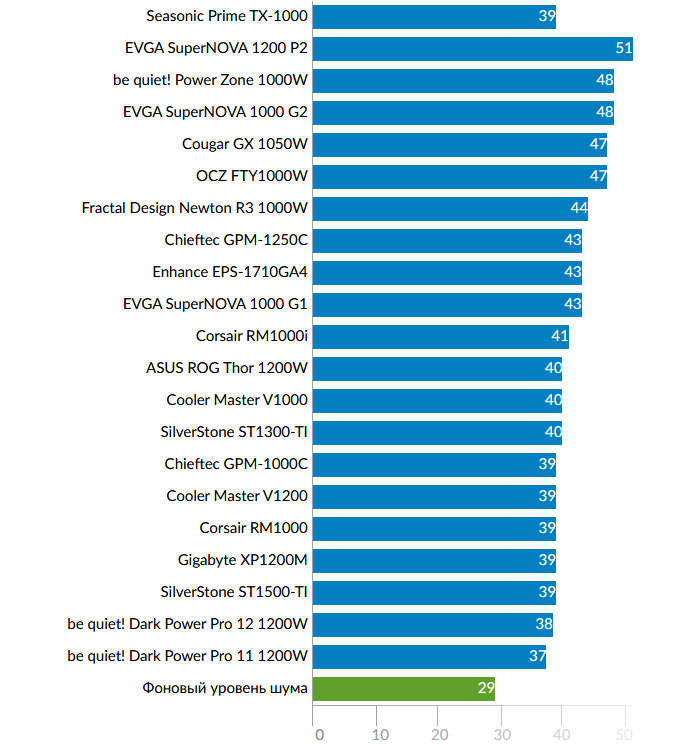 По уровню КПД с TX-1000 смог сравниться лишь SilverStone ST1500-TI (кстати, тоже построенный на платформе Seasonic). Из всех устройств с полупассивной СО вентилятор в этом режиме не включает только Corsair RM1000i, остальные блоки запускают вертушку на минимальных оборотах и демонстрируют схожий уровень шума (еле заметный «шелест», различимый только с предельно близкого расстояния).