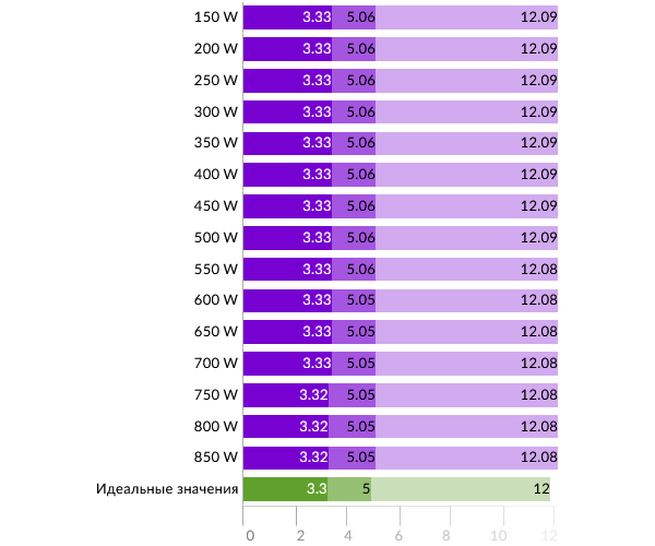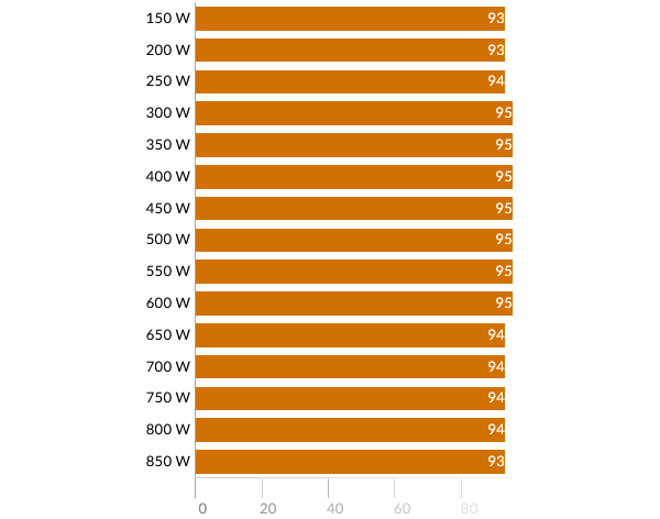 В режимах с нагрузкой 300-600 Вт блок питания обеспечивает ровную «полку» КПД на уровне 95%. Великолепный результат, доступный только самым современным «титановым» моделям. У концов графика показатель снижается до 93%.