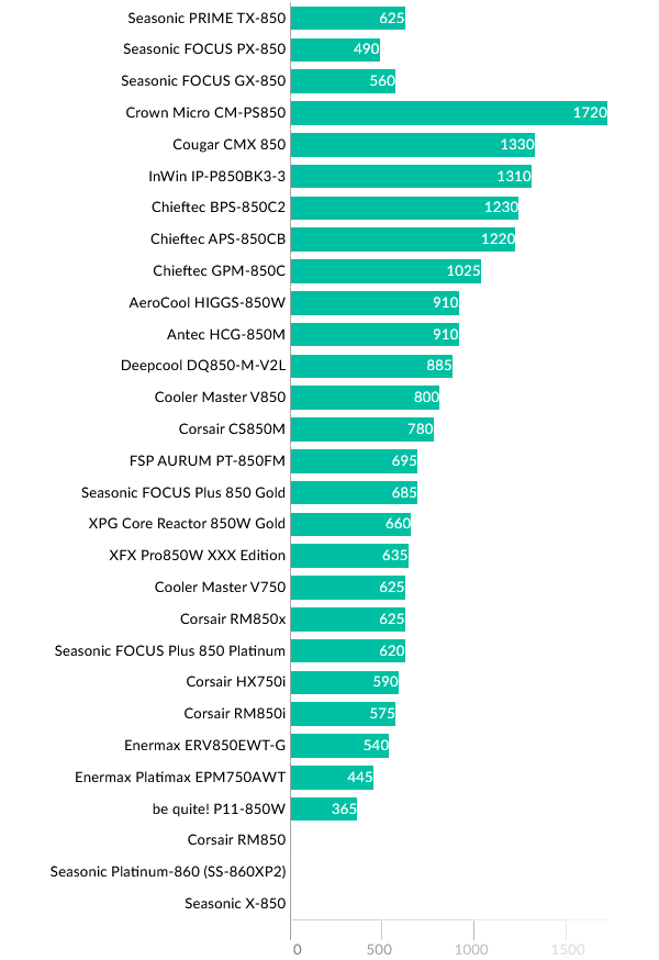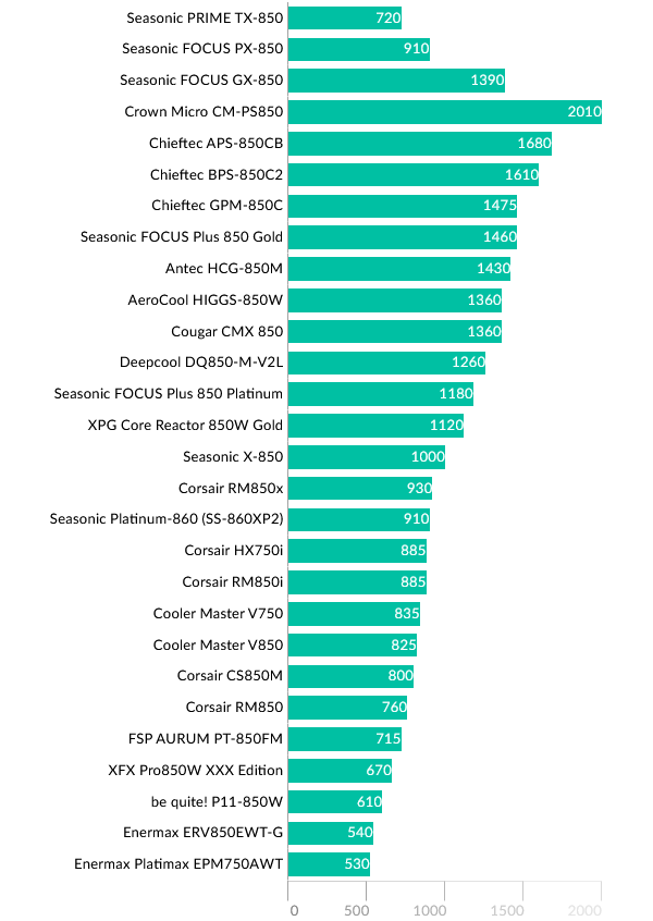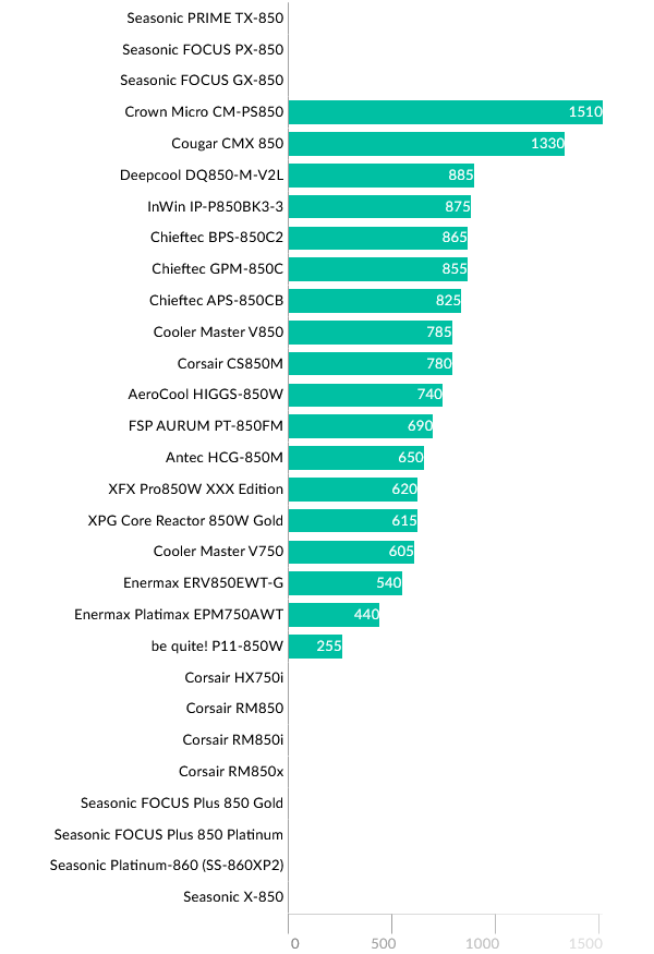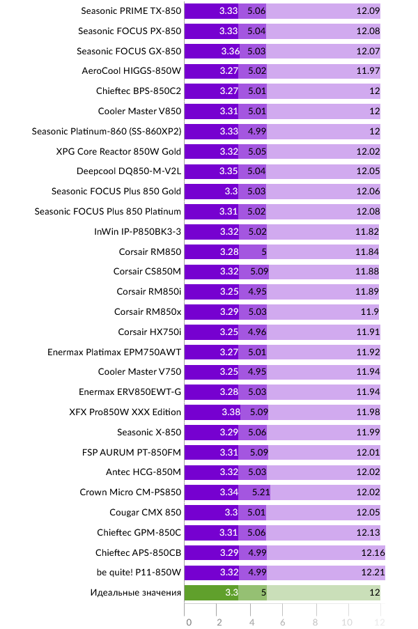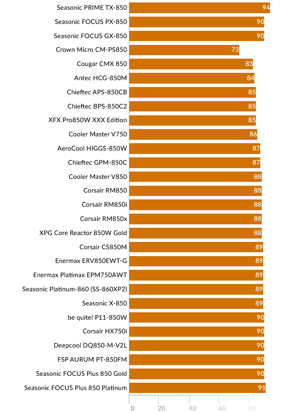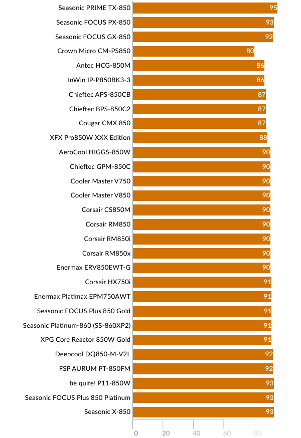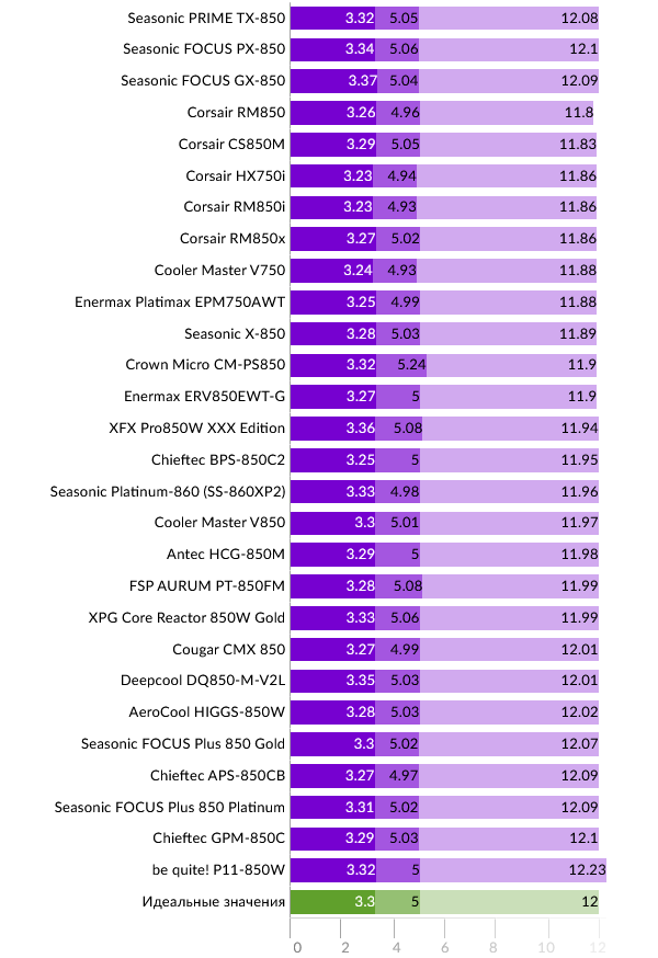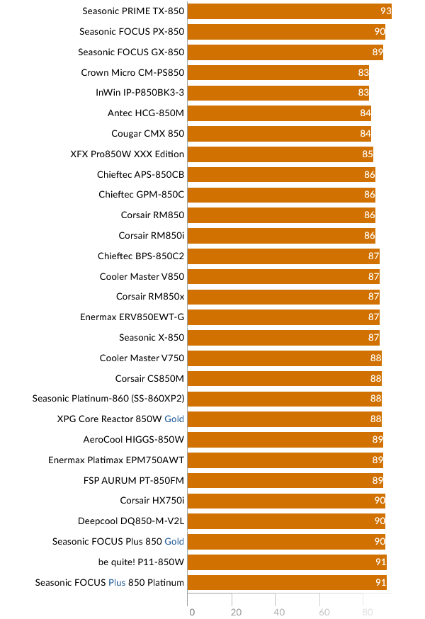 Перейдем к сравнению результатов моделей 850 Вт. В верхней части графика представлены модели FOCUS GX-850 и PX-850 для прямого сравнения.