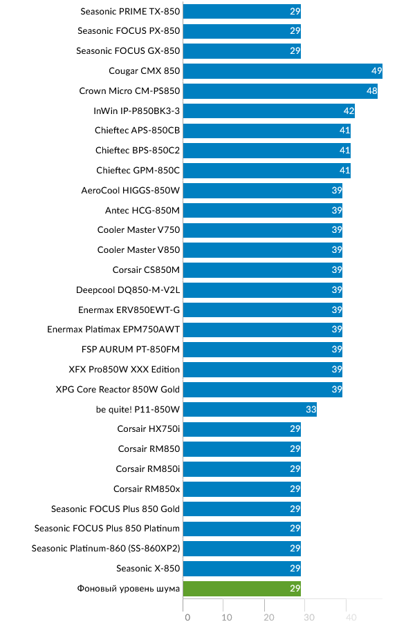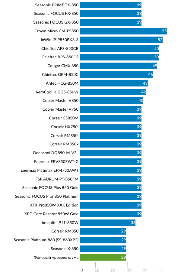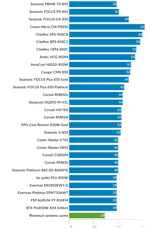 Этот режим наиболее показательно демонстрирует разницу между флагманской моделью и «просто хорошими» FOCUS. Эффективность PRIME выше на 4% (что снижает тепловыделение почти вдвое), и это закономерно приводит к уверенной победе в тесте на уровень шума. При 800-850 это различие еще более заметно: GX-850 издает заметный гул, PX-850 – «шелест», а TX-850 работает практически неслышно.