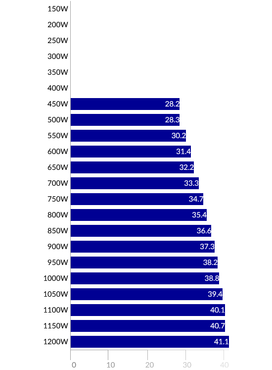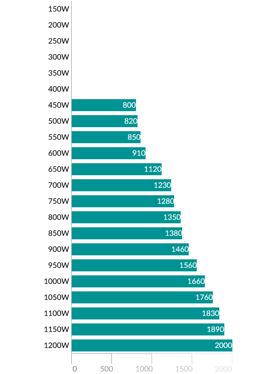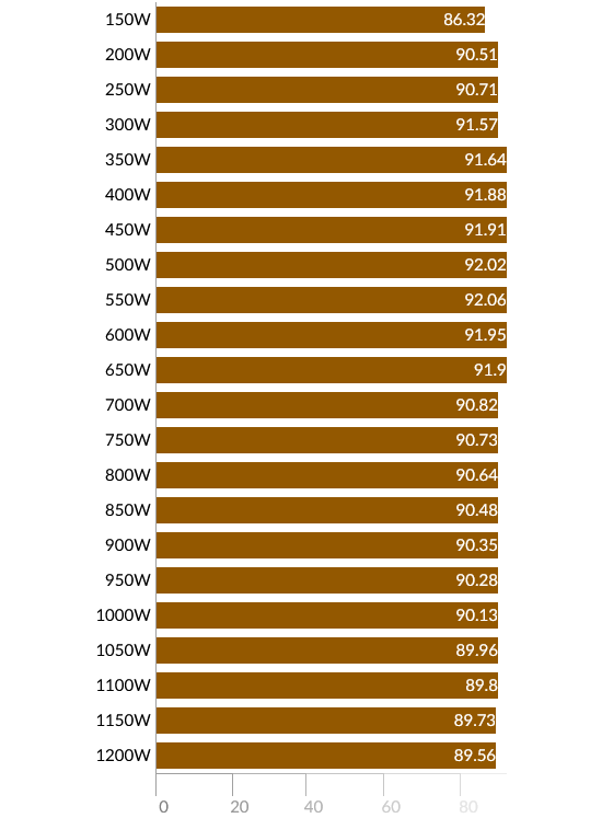 Сейчас производители сделали огромный шаг вперёд, и уже стали доступны модели стандарта 80 Plus Bronze, эффективность которых может достигать 85-88%. Модели Plus Gold при той же заявленной мощности оцениваются значительно дороже, а эффективность при этом отличается на 5%. На первый взгляд, покупать мощный блок питания нет никакого смысла, но пик эффективности обычно приходится именно на 50% мощности БП, поэтому в топовых сборках лучше использовать дорогие модели с большой максимальной мощностью.