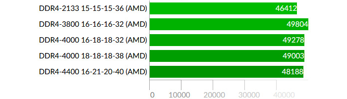 Режим DDR4-4400 оперативная память берет с CL18, что неплохо, но само по себе это бессмысленно: включается половинный делитель. А на фиксированной шине не тянет процессор 2200 МГц. Думаю, реально получить 2066 МГц, но надо повозиться, а я практически ничего не делая получил такие результаты, что неплохо.