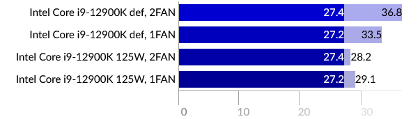 Изначально при такой нагрузке он начинает сразу потреблять 165 Вт. После пары минут работы потребление снижается до 125 Вт и замирает. Теперь хорошо видно, что кулер рассчитан именно на такие режимы работы с этим процессором, а на самом деле предназначается для моделей среднего уровня, где никаких лимитов включать не нужно, а всё работает по умолчанию из коробки. Видно, что кулер превращается в тихий и эффективный.