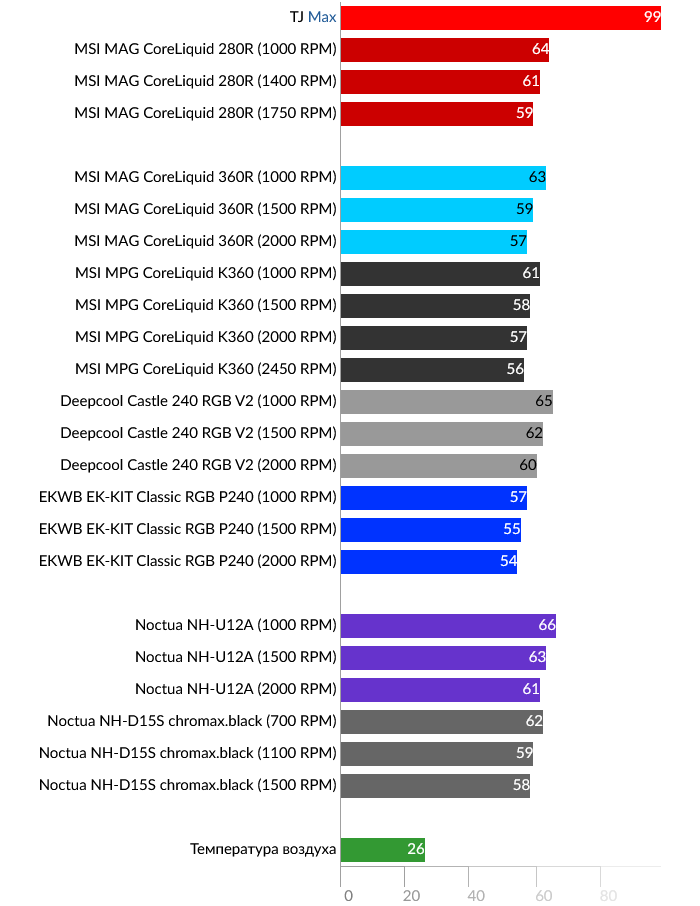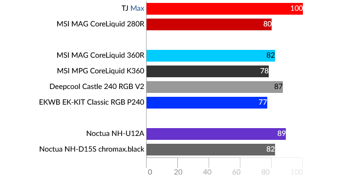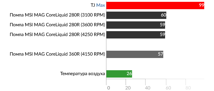 Благодаря увеличенному радиатору и более мощным вентиляторам типоразмера 140 мм версия MAG CoreLiquid 280R демонстрирует высокую эффективность, проигрывая старшей модели лишь 2-3°C.