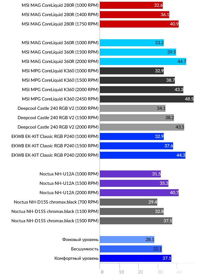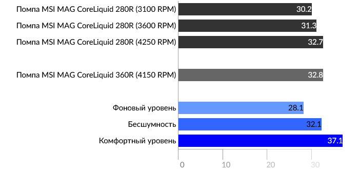 MSI MAG CoreLiquid 280R использует вентиляторы с двойным шарикоподшипником качения. Они остаются бесшумными до 850 об/мин, тихими – до 1500, комфортными – до 1600 об/мин.