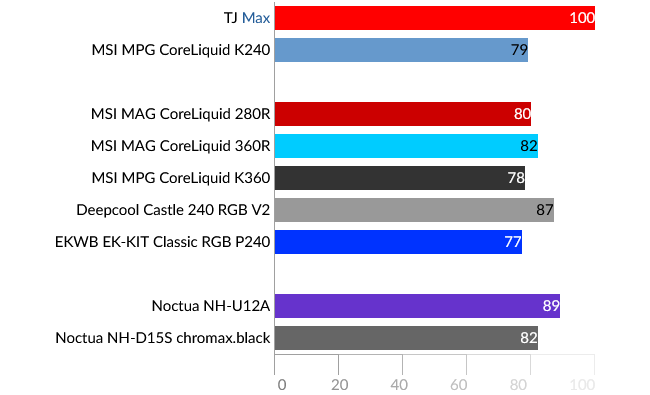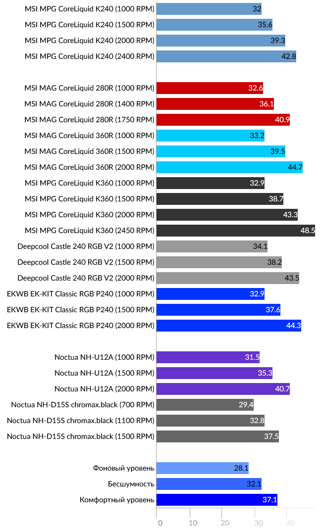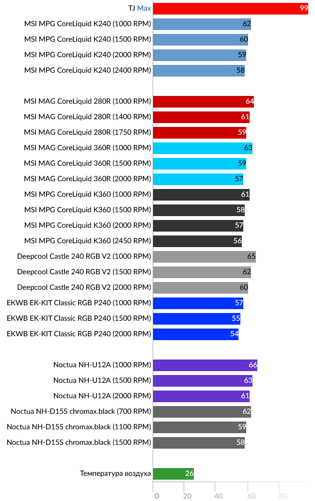 Для конкурентной борьбы были добавлены два топовых воздушных кулера Noctua NH-U12A и Noctua NH-D15S chromax.black, честь бюджетных необслуживаемых СЖО защищала Deepcool Castle 240 RGB V2. Среди прочих участников – кастомный контур компании EKWB EK-KIT Classic RGB P240 и модели MSI.
