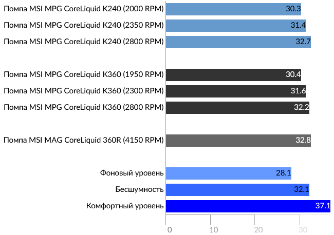 MSI MPG CoreLiquid K240 использует вентиляторы MSI Torx 4.0 (PLA12025B12H) с двойным подшипником качения. У данного экземпляра их можно назвать условно бесшумными до 1050 об/мин, тихими – до 1450 об/мин, комфортными – до 1700 об/мин.