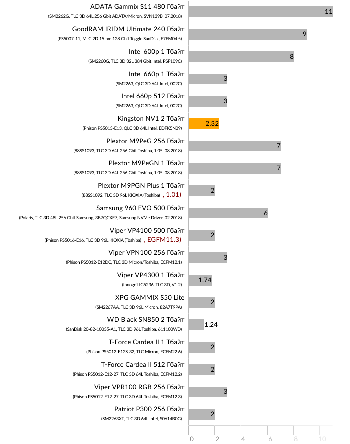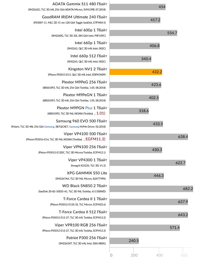 Примененный контроллер Phison E13 – четырехканальный, т.е. средний (или даже чуть ниже) по уровню. Высокоскоростные контроллеры делаются 8-канальными, что позволяет им повысить производительность за счет большего распараллеливания данных.