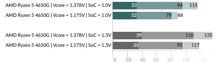 Мой экземпляр Ryzen 5 4650G согласно утилите Clock Tuner for Ryzen обладает бронзовым сертификатом, что подтвердилось на практике: со стоковой частоты 4300 МГц он неохотно покоряет 4400 МГц и со скрипом берет отметку 4500 МГц. Поэтому временно оставил ядра в покое. Однако другие стороны APU раскрылись в полной мере. Во-первых, он отлично даунвольтится.