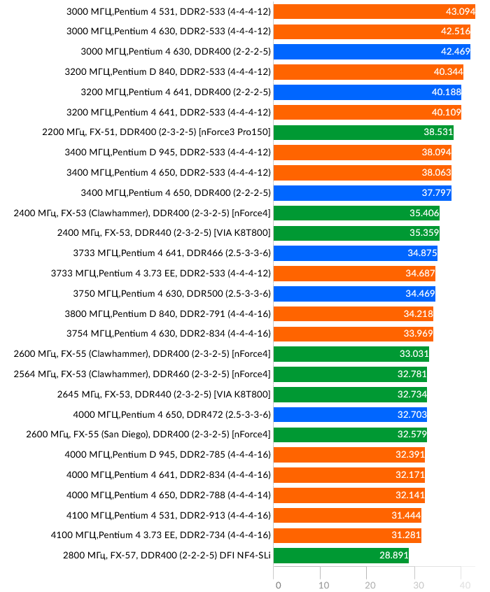 Прирост производительности у новой платформы здесь также имеется, но до AMD все еще далеко. Весьма радует тот факт, что на частоте 4100 МГц Pentium 4 531, основанный на ядре «Prescott», с одним мегабайтом кэша второго уровня очень неплохо показывает себя данном бенчмарке.