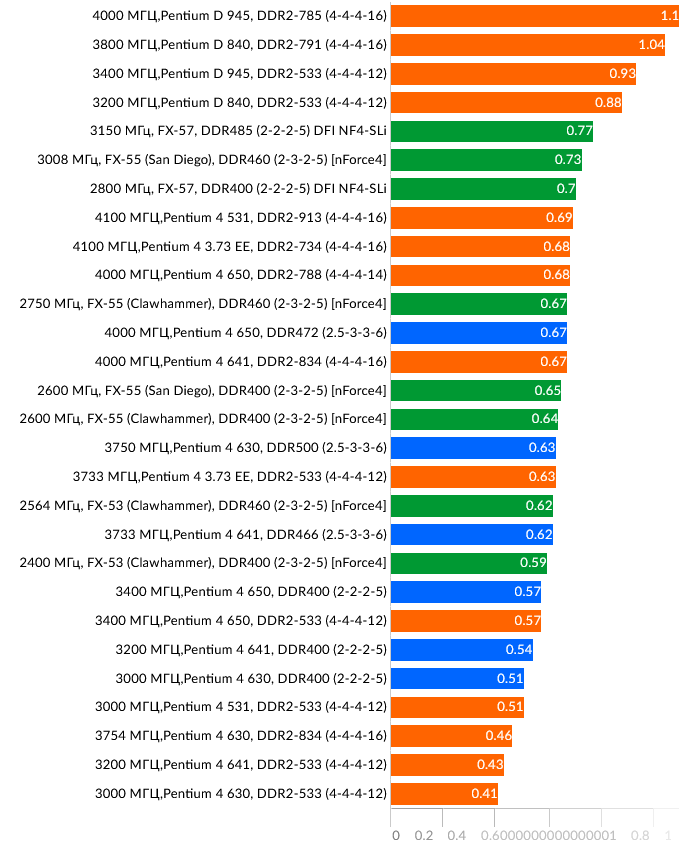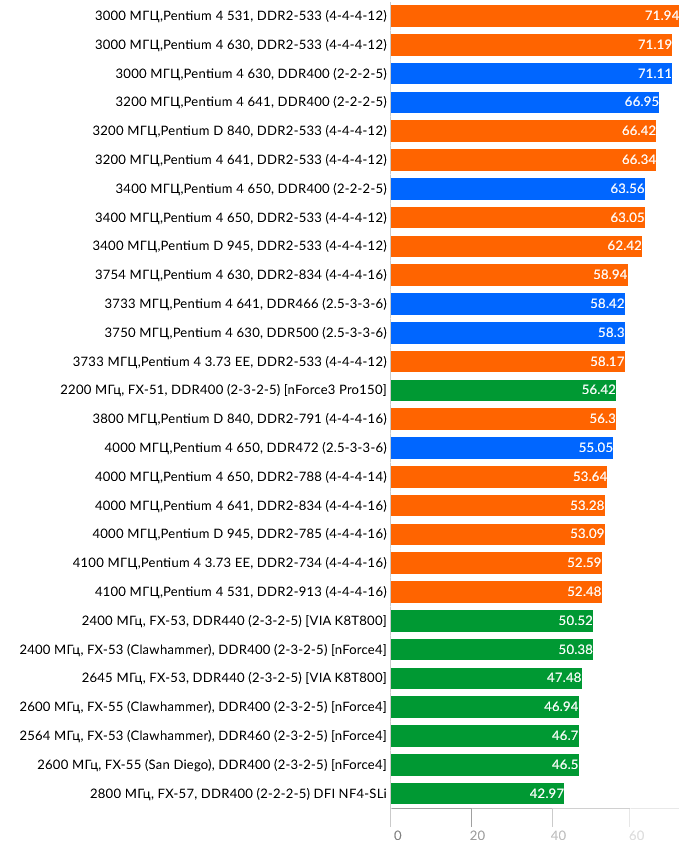 Первые Athlon FX, лишенные SSE3 инструкций, сразу оказались за бортом. Как ни странно, платформа с чипсетом Intel 875P и DDR-SDRAM памятью первого поколения оказалась значительно быстрее, хотя сам тест дает приличную разбежку в результатах, но в данном случае я совершал три прогона для каждого CPU и выбирал лучший результат. За счет поддержки многопоточности платформа Intel одержала итоговую победу.