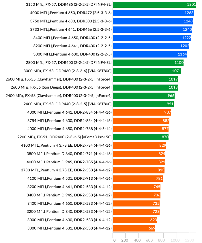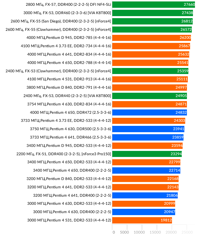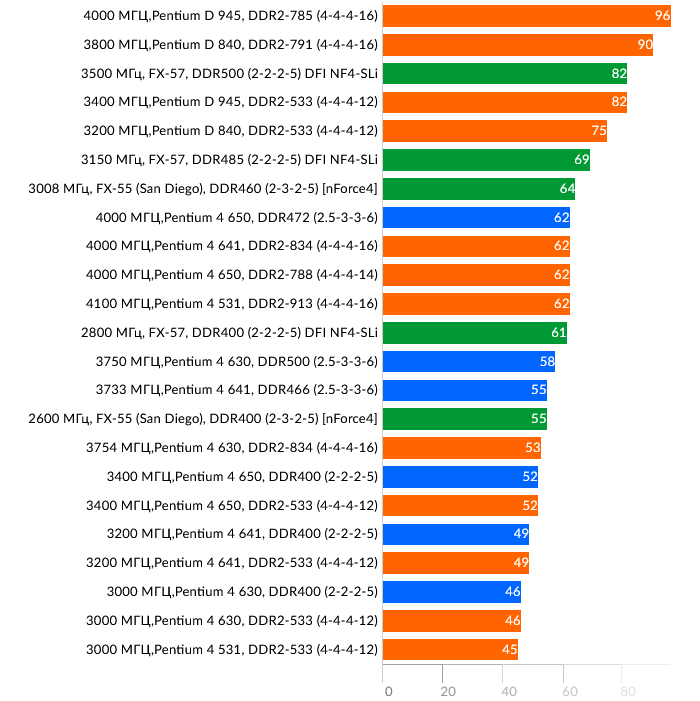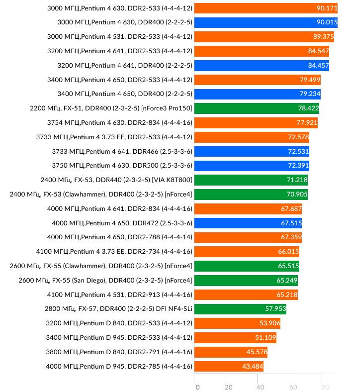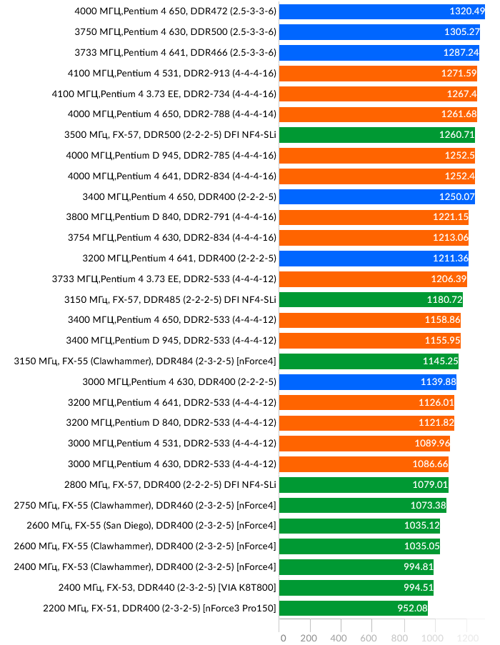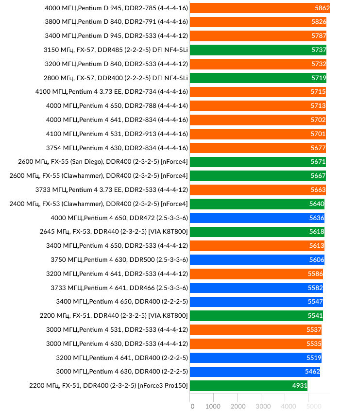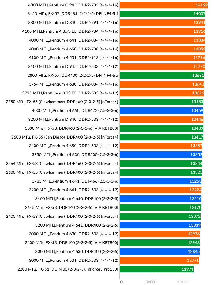 В 3DMark 2005 процессоры Intel с памятью DDR2-SDRAM взяли вообще все верхние строчки результатов.