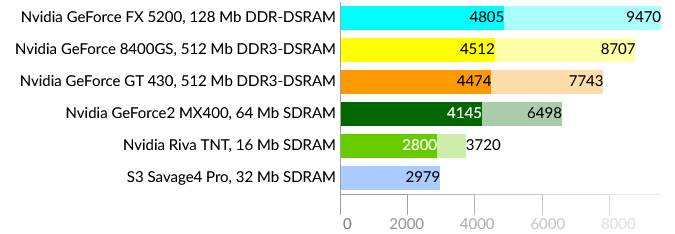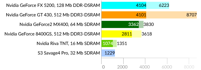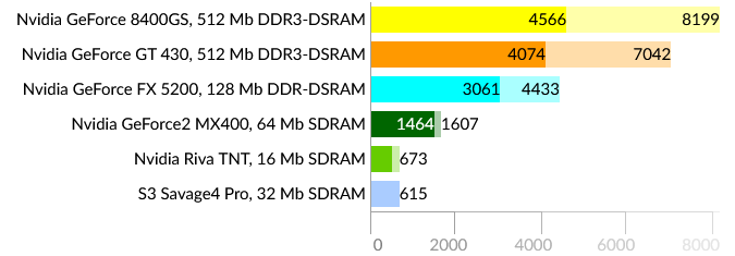 С ростом производительности и большей загрузкой GPU на первую позицию выходит GeForce GT 430, второе место занимает GeForce FX 5200, а на третьем располагается GeForce2 MX400 и чуть поодаль GeForce 8400GS.