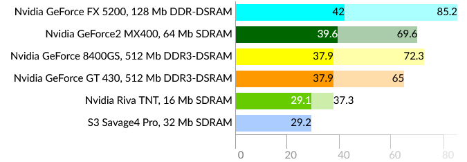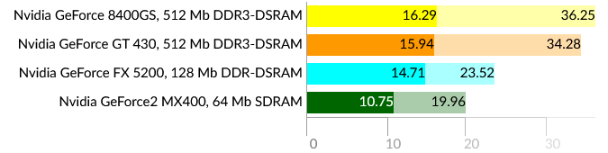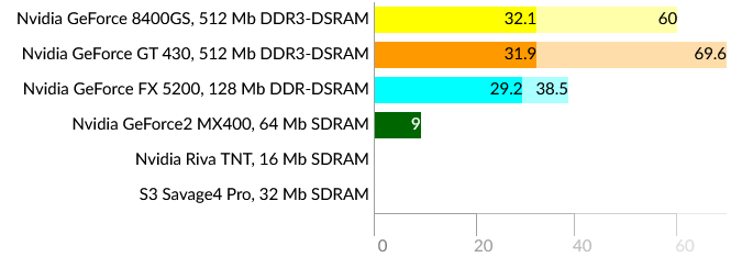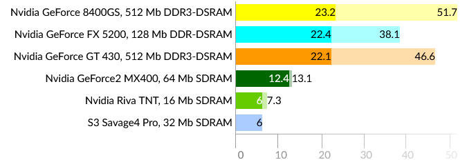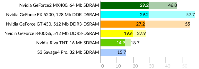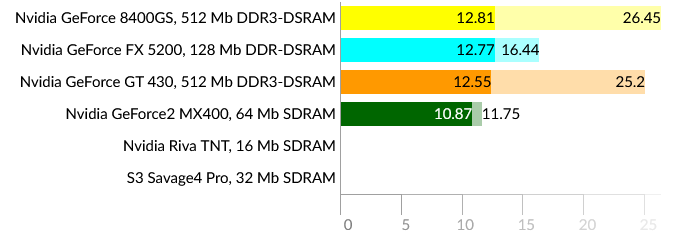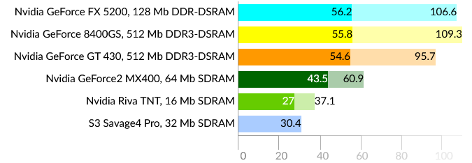 При низкой частоте CPU разницы между GeForce2 MX400 и GeForce FX 5200 - нет. Далее с минимальным отрывом идет GeForce GT 430, демонстрируя порядка 27 кадров в секунду. Надо отметить, что такой FPS считался вполне играбельным в то время. При возросшей частоте процессора первое место делят GeForce FX 5200 и GeForce GT 430. Третье отходит к GeForce2 MX400.