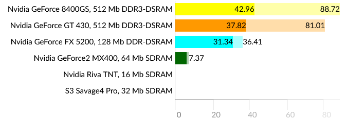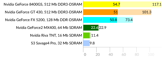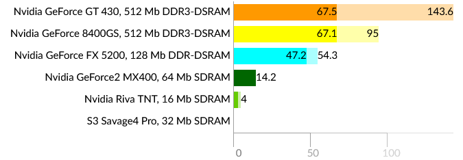 S3 Savage4 Pro попросту не смог ничего показать, хотя 3 и 4 кадра в секунду для RIVA TNT можно также назвать провалом. GeForce2 MX400 также провалил данный тест, но понизив разрешение и уровень графики, на нем вполне по силам с помощью рокетджампа сделать свой победный хэдшот. На этот раз в лидерах GeForce GT 430 с FPS over 100+, далее идет GeForce 8400GS и замыкает троицу GeForce FX 5200.